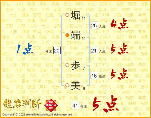 生活面を象徴する運勢です。外部から受ける影響力を表し、結婚運、家庭運や職場、環境への順応性を表します。総運から人運を引いた画数。姓や名が1文字の場合を除く。