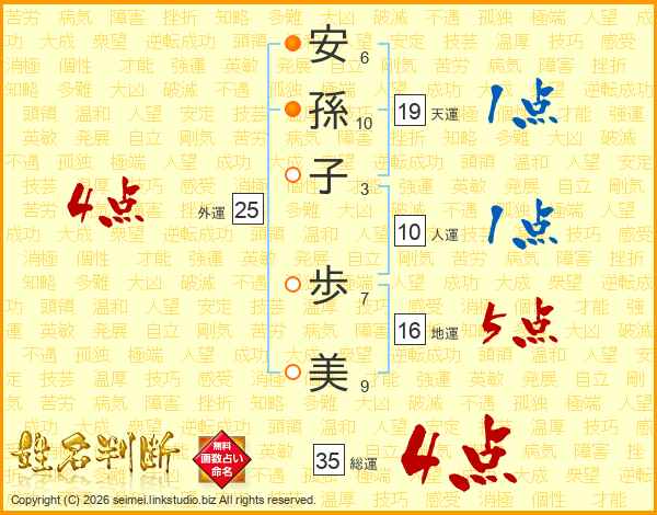 安(6画)孫(10画)子(3画) 歩(7画)美(9画)