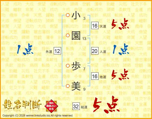 生活面を象徴する運勢です。外部から受ける影響力を表し、結婚運、家庭運や職場、環境への順応性を表します。総運から人運を引いた画数。姓や名が1文字の場合を除く。