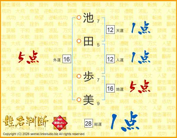 池(7画)田(5画) 歩(7画)美(9画)