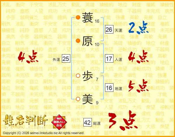 蓑(16画)原(10画) 歩(7画)美(9画)