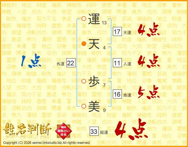 運(13画)天(4画) 歩(7画)美(9画)