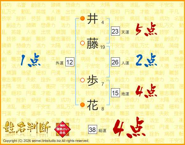 井(4画)藤(19画) 歩(7画)花(8画)