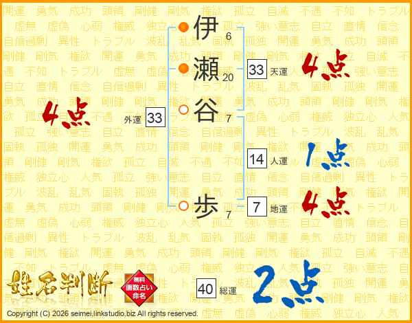 伊(6画)瀬(20画)谷(7画) 歩(7画)