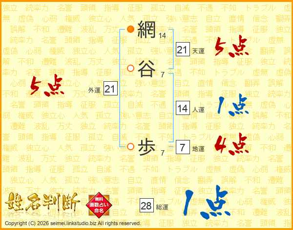 生活面を象徴する運勢です。外部から受ける影響力を表し、結婚運、家庭運や職場、環境への順応性を表します。総運から人運を引いた画数。姓や名が1文字の場合を除く。
