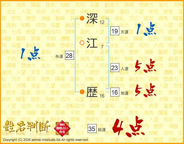 生活面を象徴する運勢です。外部から受ける影響力を表し、結婚運、家庭運や職場、環境への順応性を表します。総運から人運を引いた画数。姓や名が1文字の場合を除く。