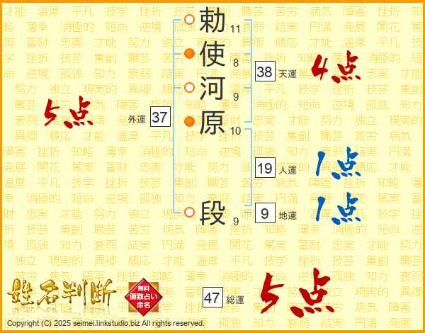 勅(11画)使(8画)河(9画)原(10画) 段(9画)