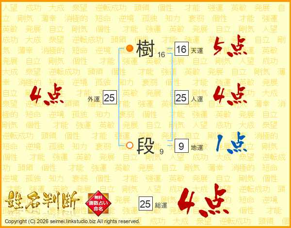 あなたの人生を表す1番重要な運勢です。生涯を通じて影響する総合運となり、主に50歳以降の晩年期に影響を及ぼします。苗字と名前の合計画数。