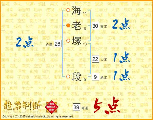 あなたの人生を表す1番重要な運勢です。生涯を通じて影響する総合運となり、主に50歳以降の晩年期に影響を及ぼします。苗字と名前の合計画数。