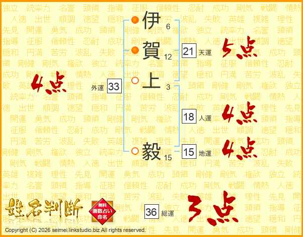 伊(6画)賀(12画)上(3画) 毅(15画)
