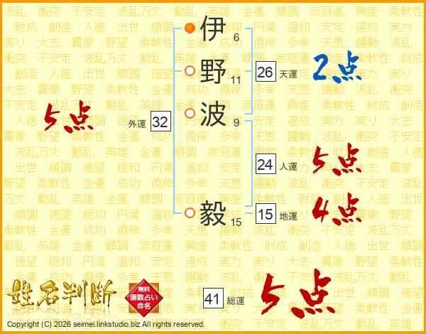 家系が持つ宿命的な運勢を表します。祖先から受け継いだ苗字ですので自分の力が及びません。家柄を象徴します。苗字の合計画数。