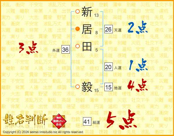 画数の奇数(○陽)と偶数(●陰)の配列で吉凶を占います。どちらかにかたよる名前は大凶名で避ける必要があります。画数の奇数偶数。
