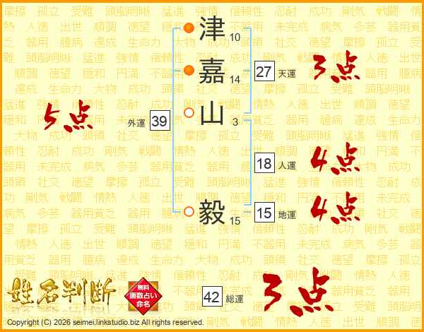 津(10画)嘉(14画)山(3画) 毅(15画)