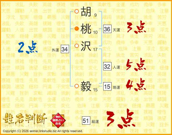 胡(9画)桃(10画)沢(17画) 毅(15画)