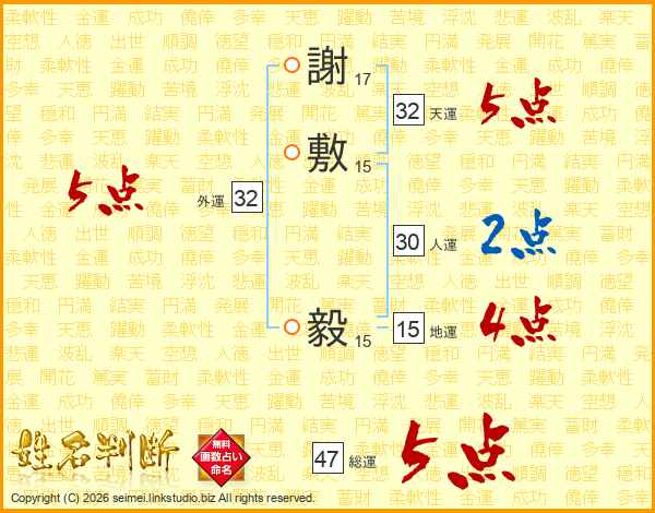 謝敷毅さんの総運は47画の5点!