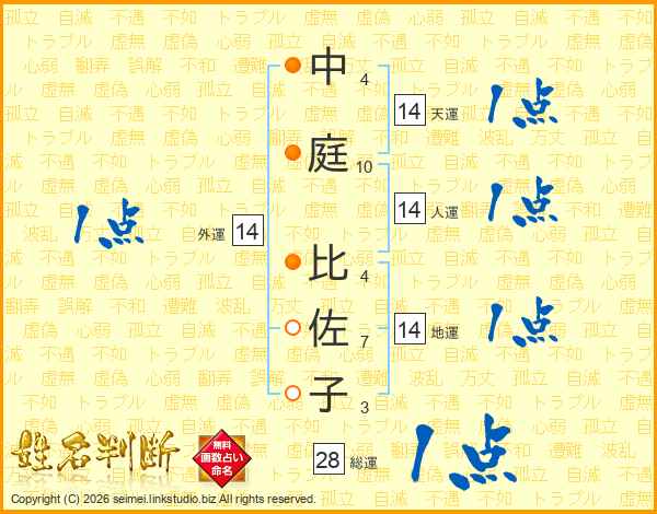 中庭比佐子さんの人運は14画の1点!