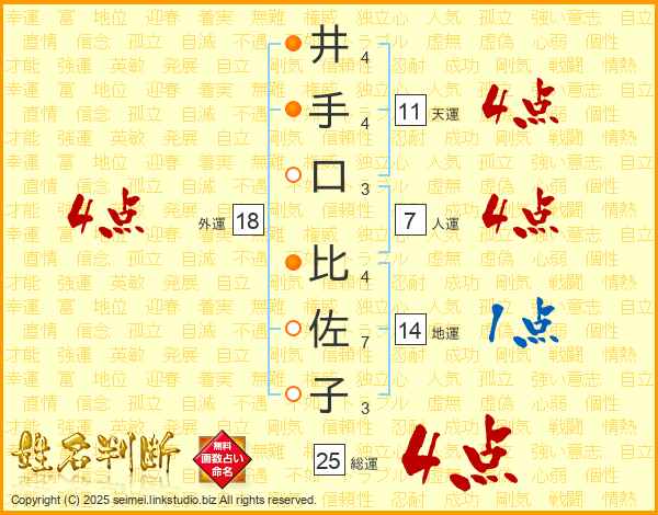 井(4画)手(4画)口(3画) 比(4画)佐(7画)子(3画)