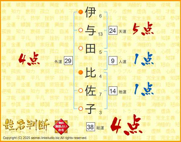 伊(6画)与(13画)田(5画) 比(4画)佐(7画)子(3画)