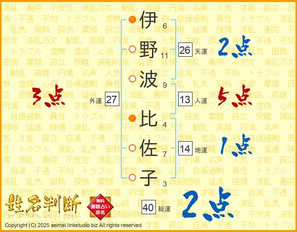 伊(6画)野(11画)波(9画) 比(4画)佐(7画)子(3画)