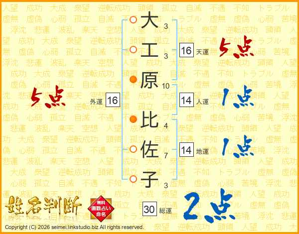 大工原比佐子さんの総運は30画の2点!