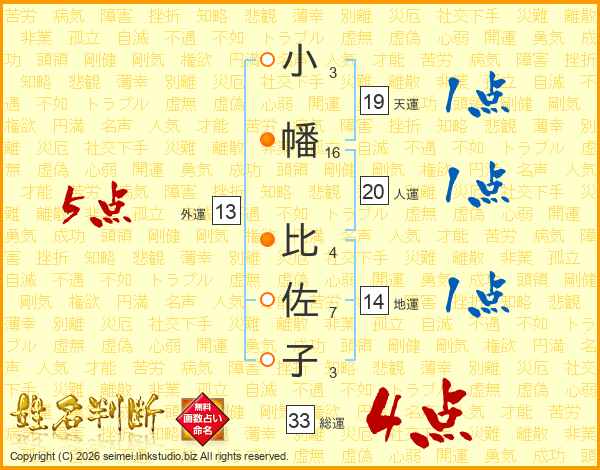 小(3画)幡(16画) 比(4画)佐(7画)子(3画)