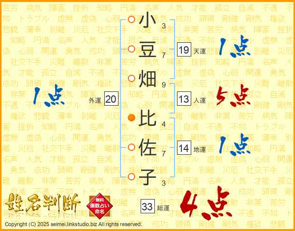 小豆畑比佐子さんの総運は33画の4点!