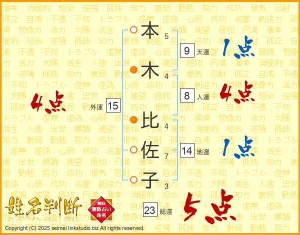 本(5画)木(4画) 比(4画)佐(7画)子(3画)