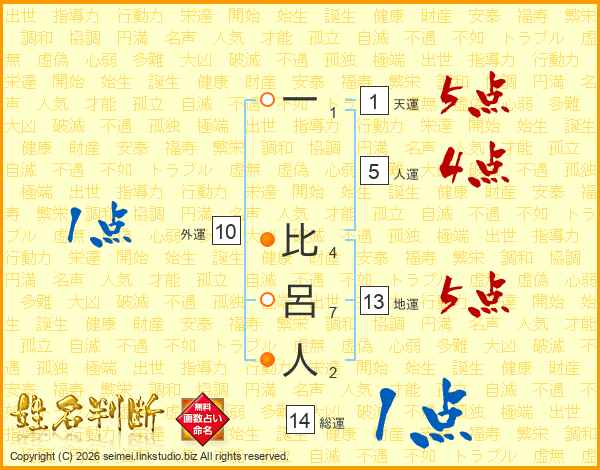 生活面を象徴する運勢です。外部から受ける影響力を表し、結婚運、家庭運や職場、環境への順応性を表します。総運から人運を引いた画数。姓や名が1文字の場合を除く。