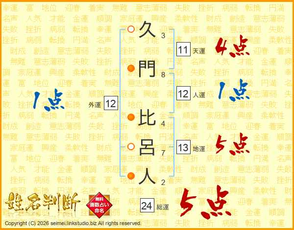久(3画)門(8画) 比(4画)呂(7画)人(2画)
