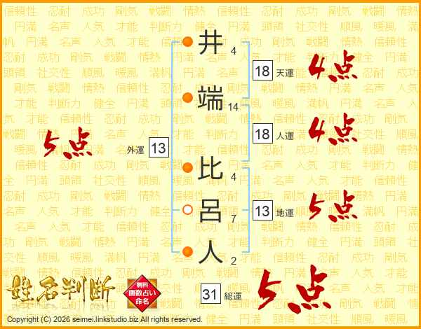 井(4画)端(14画) 比(4画)呂(7画)人(2画)
