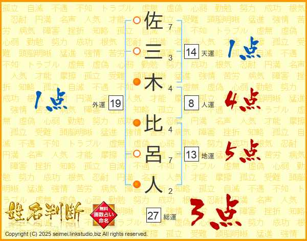 佐(7画)三(3画)木(4画) 比(4画)呂(7画)人(2画)