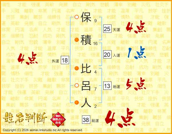 保(9画)積(16画) 比(4画)呂(7画)人(2画)