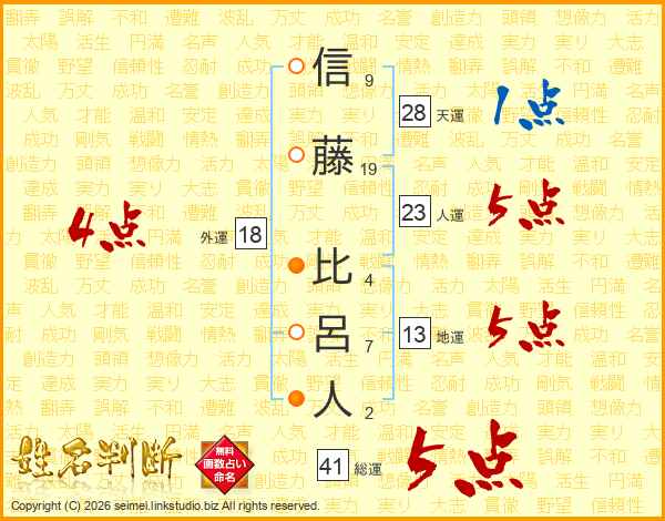 信(9画)藤(19画) 比(4画)呂(7画)人(2画)