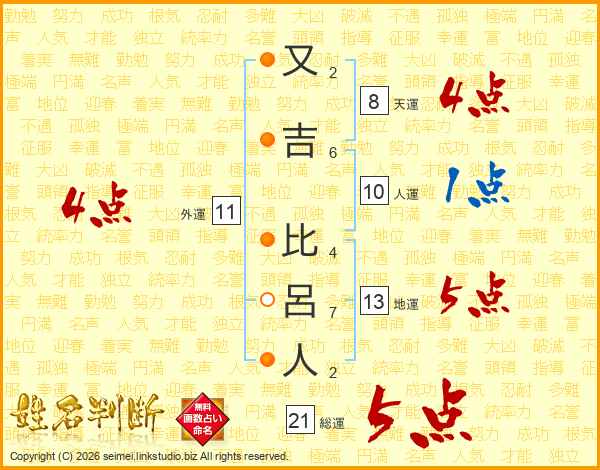 又(2画)吉(6画) 比(4画)呂(7画)人(2画)