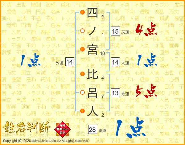 四(4画)ノ(1画)宮(10画) 比(4画)呂(7画)人(2画)