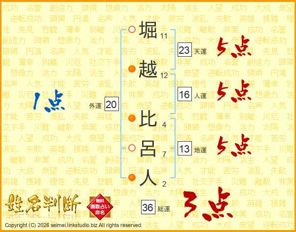 堀越比呂人さんの天運は23画の5点!