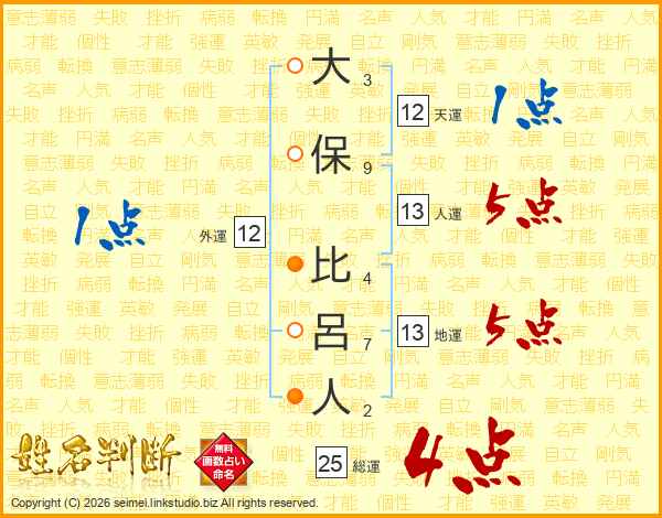 大保比呂人さんの総運は25画の4点!