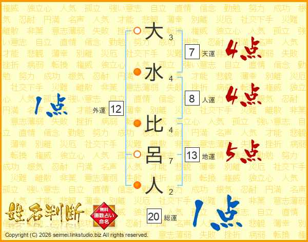 大(3画)水(4画) 比(4画)呂(7画)人(2画)