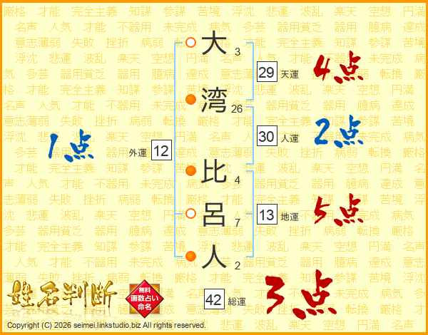 大(3画)湾(26画) 比(4画)呂(7画)人(2画)
