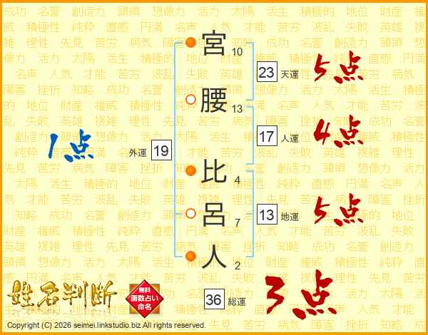 宮腰比呂人さんの天運は23画の5点!