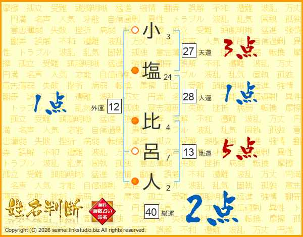 小(3画)塩(24画) 比(4画)呂(7画)人(2画)