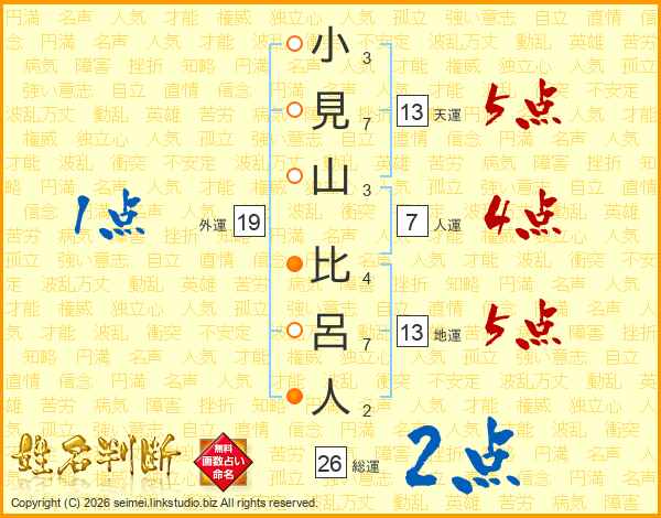 小見山比呂人さんの総運は26画の2点!
