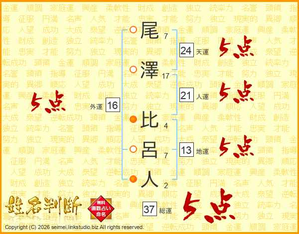 尾(7画)澤(17画) 比(4画)呂(7画)人(2画)