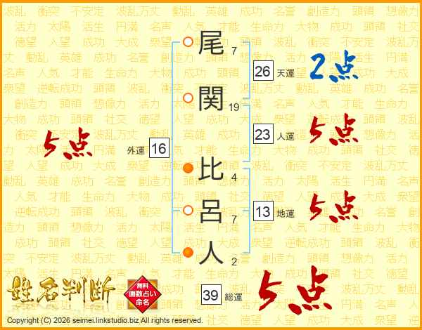 尾(7画)関(19画) 比(4画)呂(7画)人(2画)