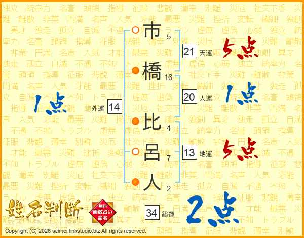 市(5画)橋(16画) 比(4画)呂(7画)人(2画)
