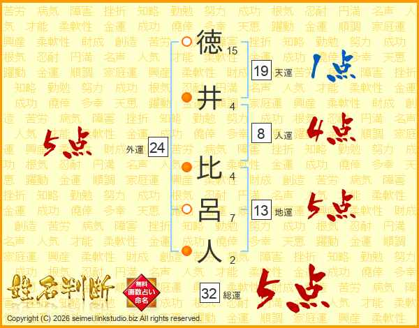 徳(15画)井(4画) 比(4画)呂(7画)人(2画)