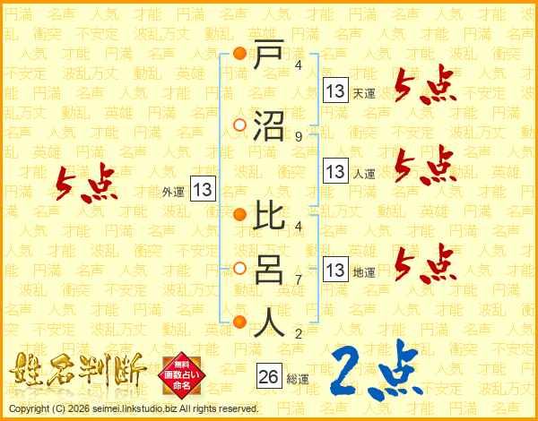 戸沼比呂人さんの総運は26画の2点!
