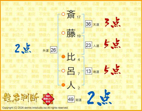 斎(17画)藤(19画) 比(4画)呂(7画)人(2画)