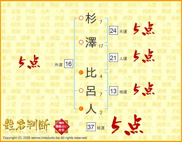 杉澤比呂人さんの総運は37画の5点!