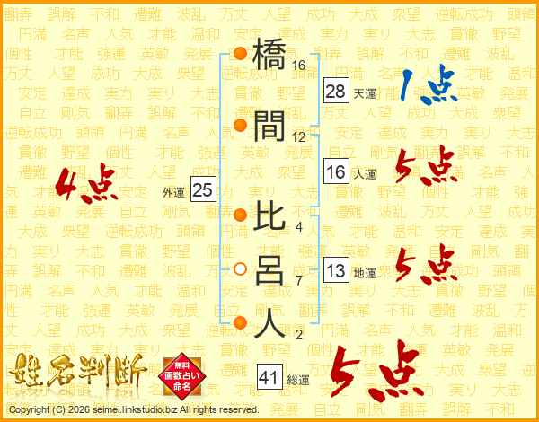 橋間比呂人さんの総運は41画の5点!